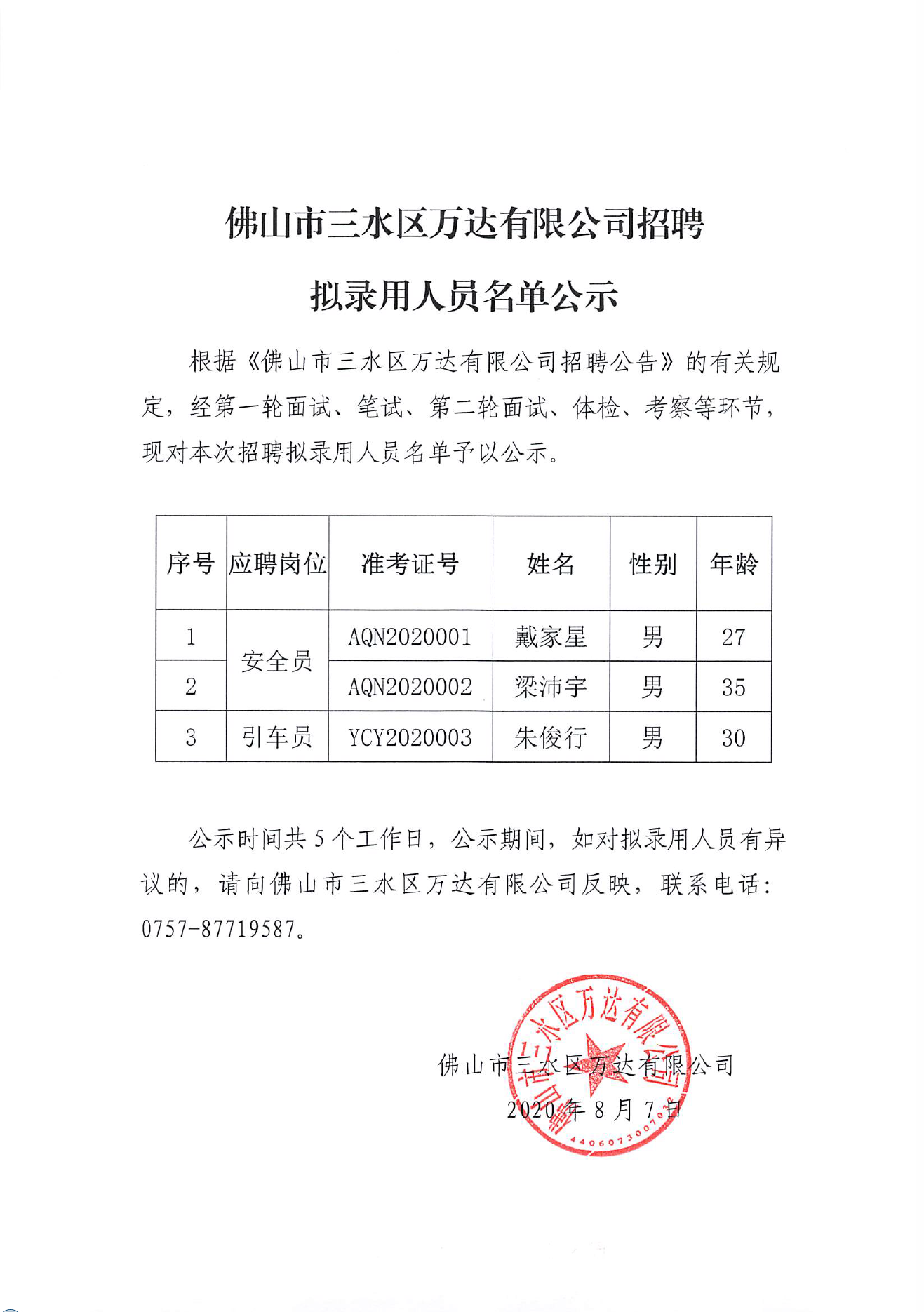 佛山市三水区万达有限公司招聘拟录用人员名单公示